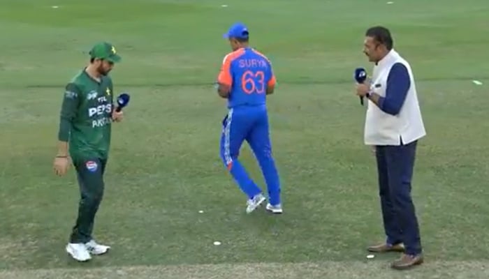After winning the toss, Suryakumar Yadav elected to bowl first and walked straight past Pakistan’s skipper to Ravi Shastri for the pre-match discussion, while Salman Ali Agha mirrored the gesture.