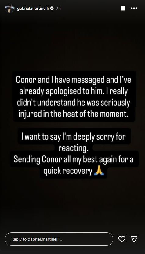 "Conor and I have messaged and I've already apologised to him. I really didn't understand he was seriously injured in the heat of the moment," Martinelli wrote. "I want to say I'm deeply sorry for reacting. Sending Conor all my best again for a quick recovery."
