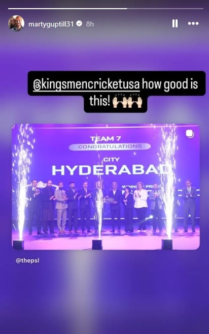 Guptill shared his excitement on Instagram, posting a story of the franchise owners receiving the team keys from Pakistan Cricket Board (PCB) Chairman Mohsin Naqvi, captioning it: "Kingsmen Cricket USA how good is this."